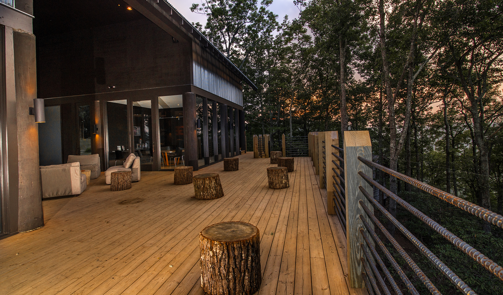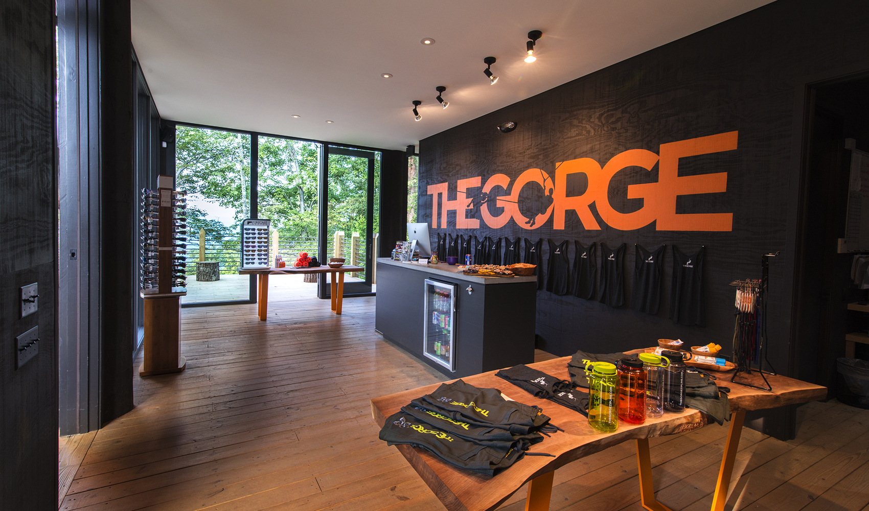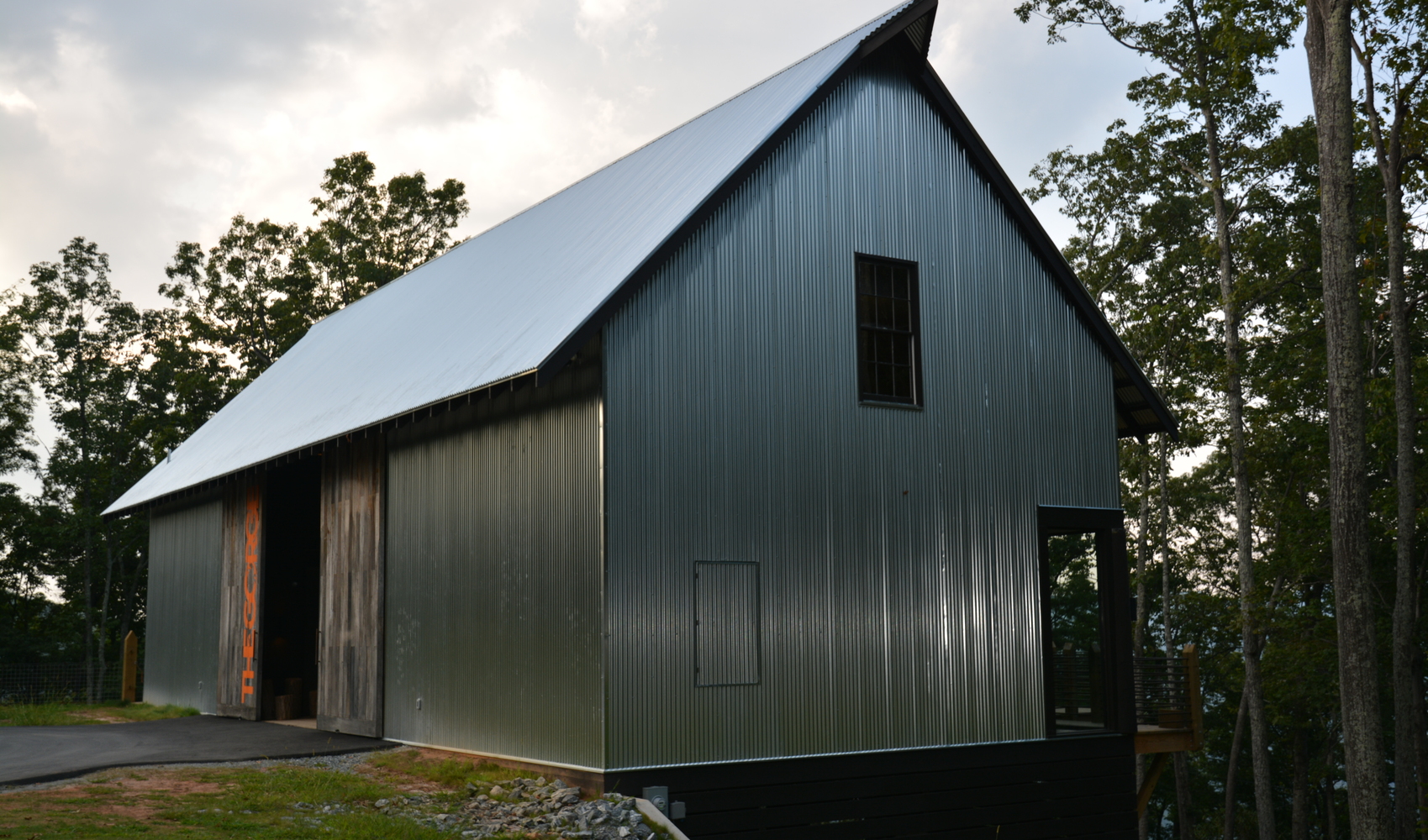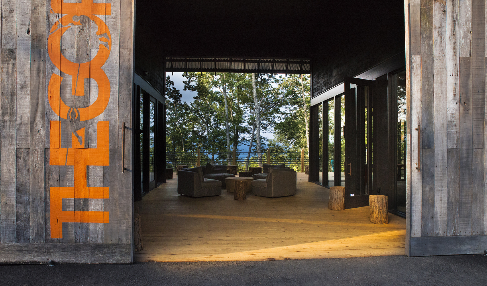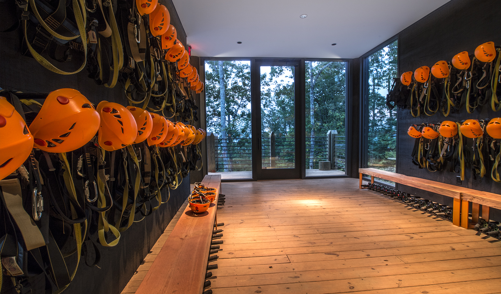 Perched on the vertical edge of the gorge in Saluda, North Carolina, the wide open feel of the headquarters for this zipline business offers organized space for gear, meetings, and lounging by clients on the ready to zip. The contemporary building design that utilized reclaimed lumber to fabricate two massive, rolling entry bay doors, fits well into the forested property without appearing out of place.